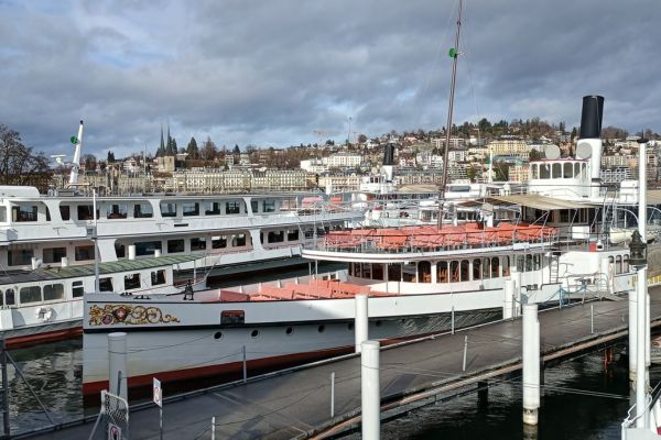 Etwas Ruhe (und eine Regenpause) finde ich hinter dem Bahnhof bei den Ausflugsbooten. Auf dem Vierwaldstätter See ist heute nicht viel los.