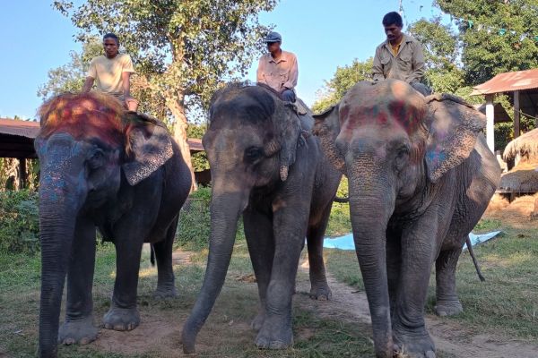 Unser Hotel lag direkt (also, mit 50 Metern Ufer dazwischen) am Fluss. Bester Blick, solange es hell war. Es war offensichtlich komplett auf ausländische Tourgruppen ausgerichtet, die zwei Nächte lang bleiben und alle das gleiche Programm bekommen: Bei uns war es am ersten Tag ein etwas seltsam zusammengestückelt wirkendes Mittagessen (das Personal schien ziemlich schockiert, dass so viele von uns vegetarisch essen wollten), gefolgt von einer Elefantenvorführung und einem Rundgang durch ein Dorf. Das war beides grundsätzlich sehr interessant, hat aber auch was von Zirkus. 🙈