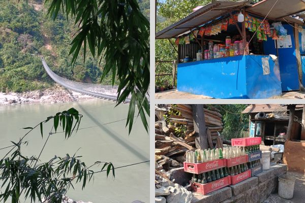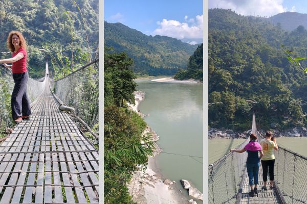 Von Pokhara aus fuhren wir zunächst auf der bekannten, ziemlich guten Straße in Richtung Kathmandu. In Mugling bogen wir nach Süden ab. Auch diese Straße, die nach Bharatpur führt, ist ziemlich gut. Aber zunächst kamen wir mal wieder an einer Hängebrücke vorbei. Davon hatten wir schon viele gesehen. Diesmal durften wir sie überqueren. Die Familie, die den Kiosk am Straßenrand betrieb, hielt uns offensichtlich für bekloppt, dass wir angesichts einer Brücke so aufgeregt waren. 😂