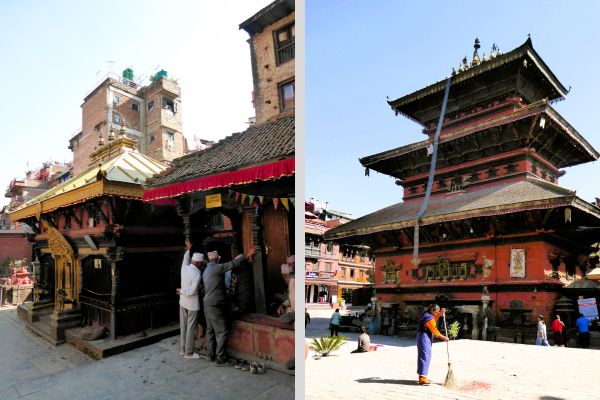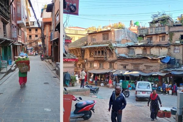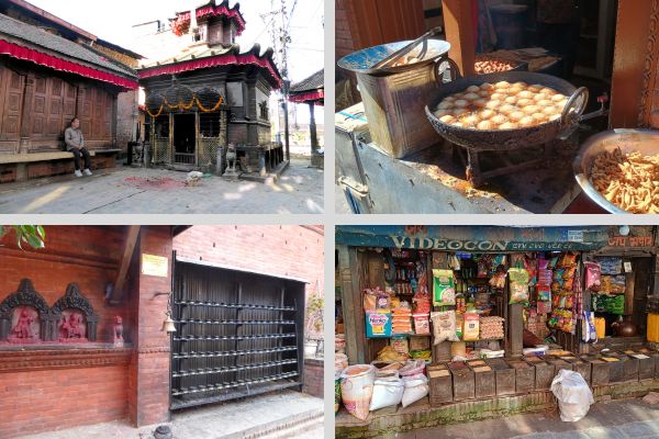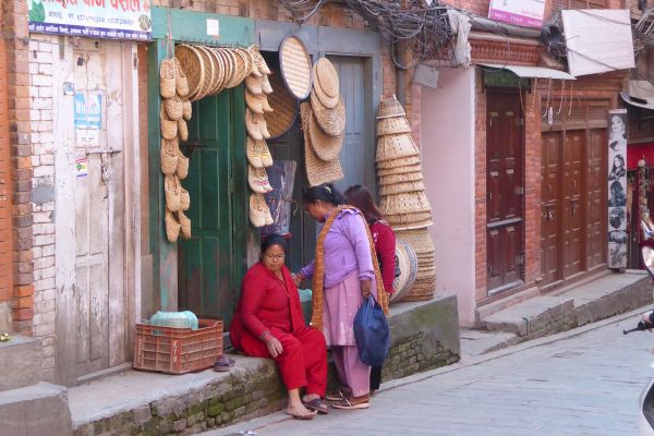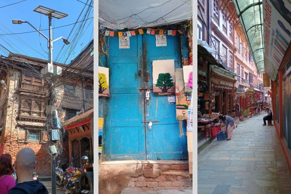 Abseits vom Durbar Square, auf dem der Königspalast steht, sieht es bald anders aus. Es wird bunter, die Stromleitungen werden zahlreicher, ebenso die Souvenirshops.