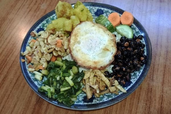 Um kurz nach 12 hatte ich unseren Guide gefragt, wann es denn Mittagessen gäbe. Er hatte ziemlich konsterniert geschaut und schließlich geknurrt, na gut, es gebe da ein Lokal. War auch ein hübscher Laden. Aber das Essen war mehr international als lokal und preislich ambitioniert. Klar, als Guide will man nicht, dass sich die Gruppe gleich am ersten Tag geschlossen Brechdurchfall zuzieht. Trotzdem ging ich abends doch lieber nicht mit den anderen essen. Gleich um die Ecke von unserem Gästehaus gab es ein sehr gut bewertetes Restaurant, mit Plastikstühlen und offener Küche, wie es sich in Asien gehört. 😁