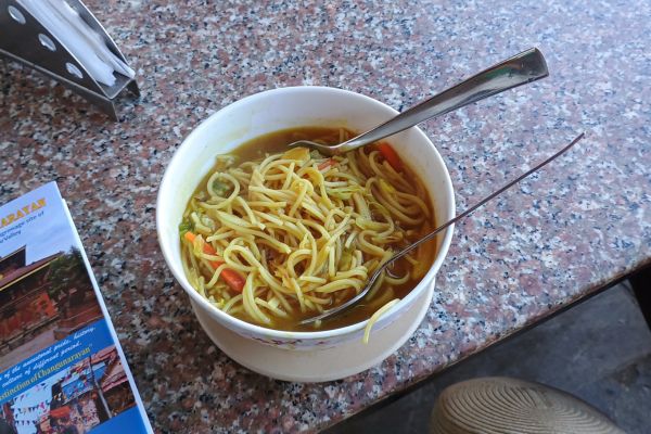 Und der Changu Narayan Tempel hat mir sehr gut gefallen. Nicht nur wegen der hervorragenden Suppe, die ich dort bekommen habe. (Janak leistete schon deutlich weniger Widerstand gegen das Projekt Mittagessen als an den vergangenen Tagen.) Das Changu Restaurant ist gleich links am Parkplatz. Sieht nicht nach viel aus, hatte aber die beste Thukpa, die ich auf der Reise gegessen habe.